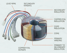 Toroidal Power Transformers are made with tape wound cores. The tape wound cores provide an almost perfect magnetic circuits to minimize losses, fringing, leakage, distortion, and provide good magnetic shielding. It also decreases the magnetization force required to produce a given flux density. It is much more efficient than E-type lamination cores, but will have somewhat higher cost as the windings need to be done on the core itself, rather than on a bobbin. The tape material is made of insulated, high permeability silicon iron, with a typical thickness of 4 mils ( 0.004"). Other materials types such as 50% nickel iron alloy, Molybdenum permalloy or supermendor are also available with increased cost.